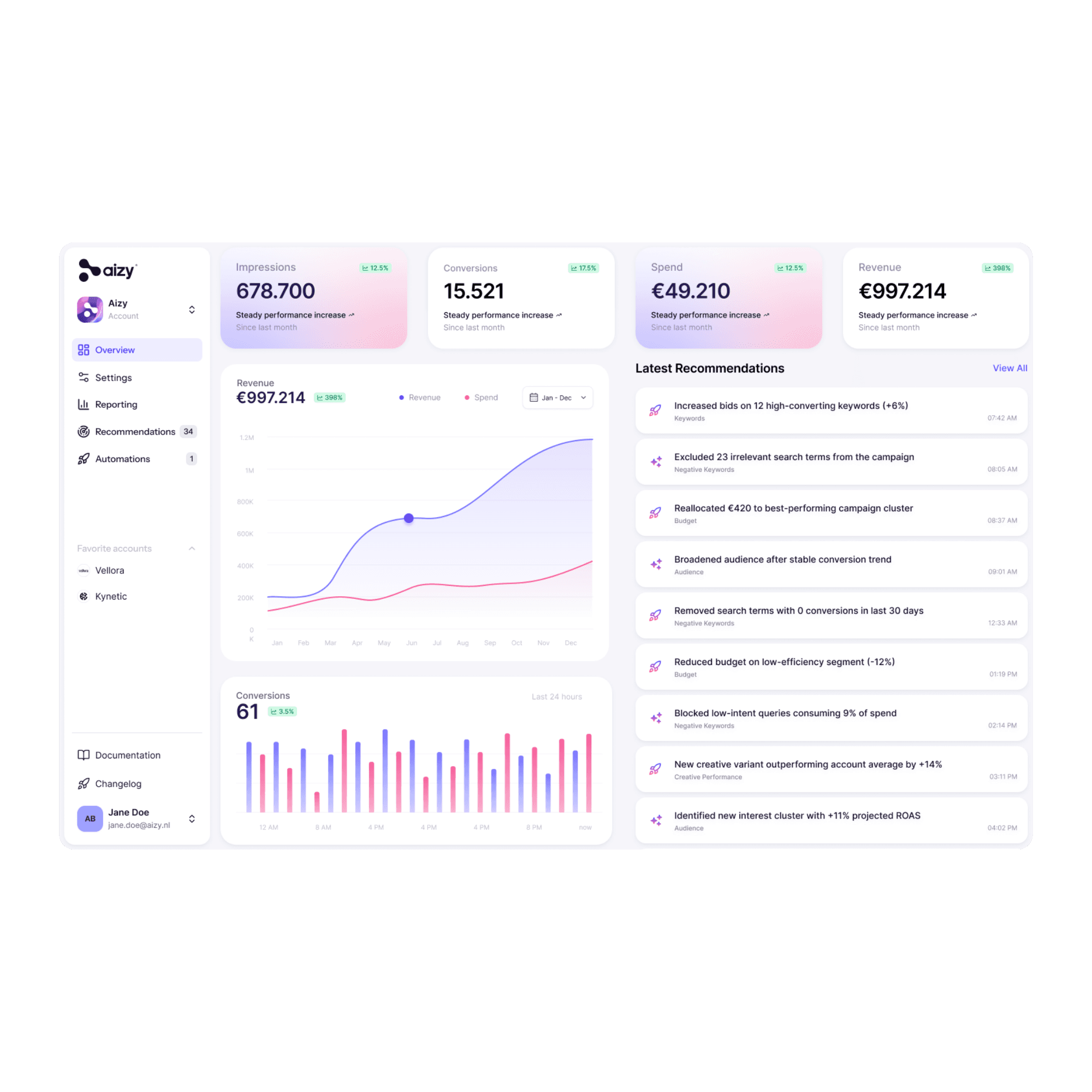 Jij focust op je klanten en kwaliteit. Aizy optimaliseert dagelijks je marketing en stuurt continu op boekingen, leads en groei.